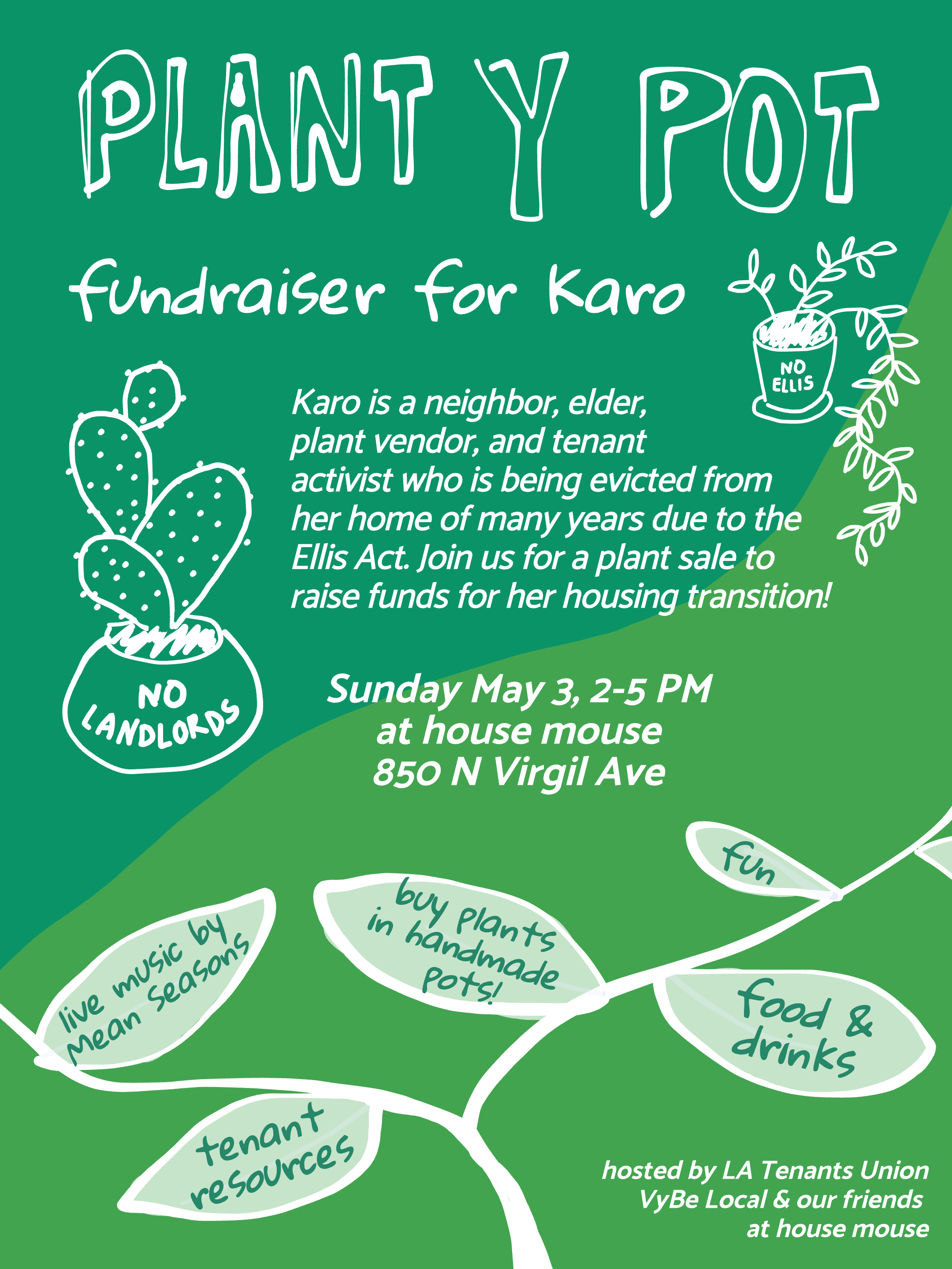 ¡Únete al Sindicato de Inquilinos de LA-VyBe Local y a nuestros amigos de @housemouse.la en PLANT Y POT, una venta de plantas y kermés para nuestra compañera Karo! Karo es vecina mayor de edad, vende plantas, y activista de los derechos de los inquilinos. Debido a la Ley Ellis, ha sido desalojada de su hogar donde ha vivido por más de una década.